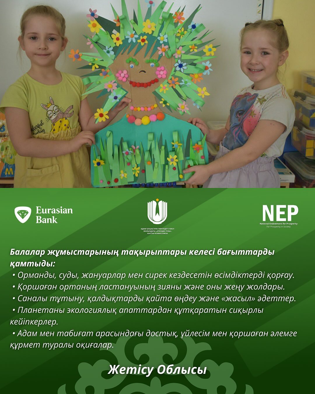 «Жасыл ертегі» атты онлайн байқау ұйымдастырылып, сәтті өткізілді. Байқаудың мақсаты- жас ұрпақта табиғатқа деген жауапты және қамқорлықпен қарау сезімін қалыптастыру, сондай-ақ шығармашылық өзін-өзі білдіру арқылы экологиялық құндылықтарды насихаттау.