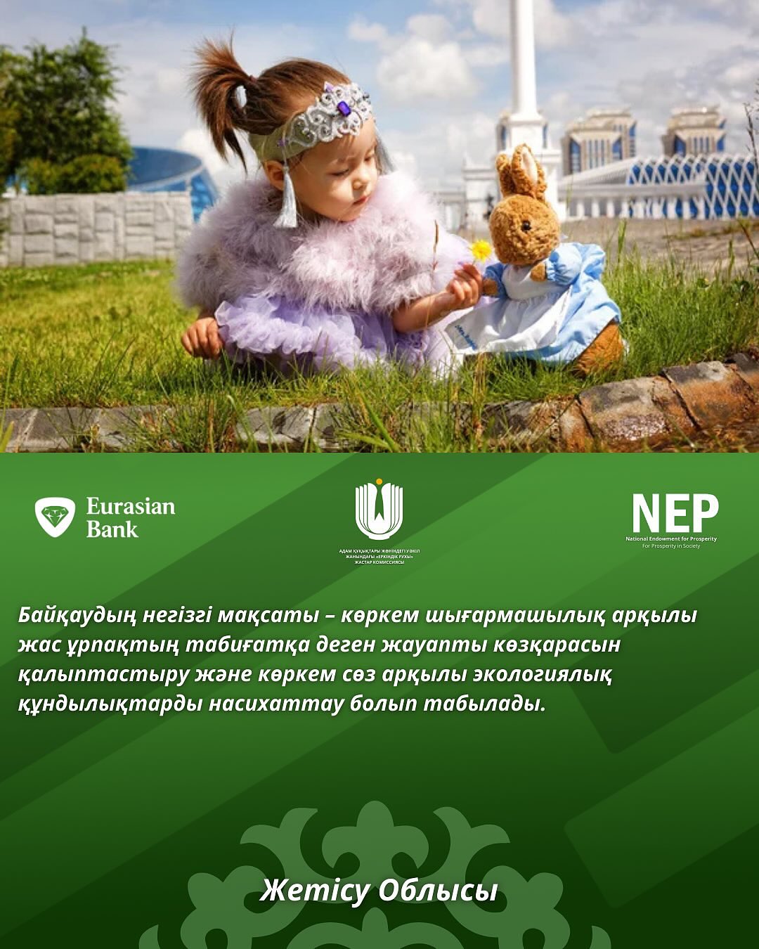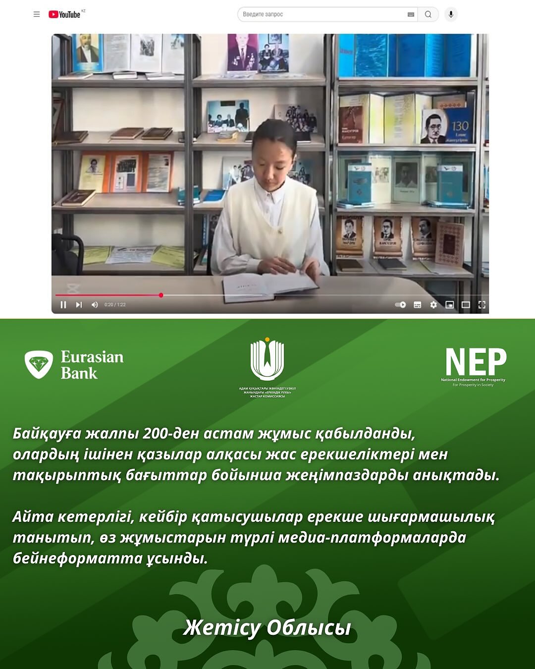 «Еуразиялық банк» АҚ-ның қолдауының арқасында байқау жоғары деңгейде ұйымдастырылып, кең көлемде қоғамдық назарға ие болып, қатысушылар мен серіктестер тарапынан оң пікірлерге ие болды.