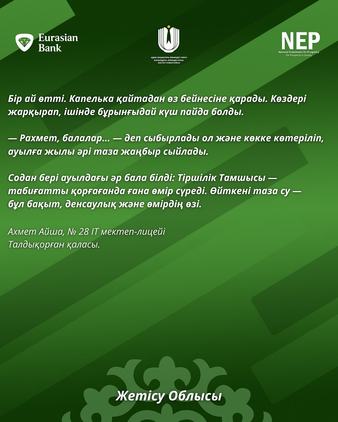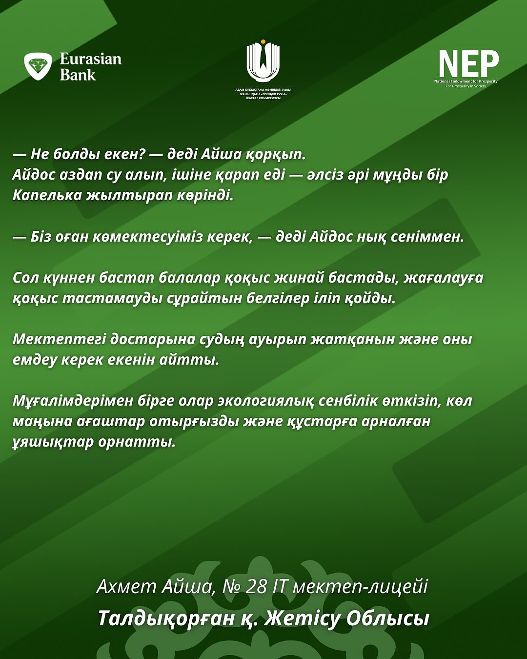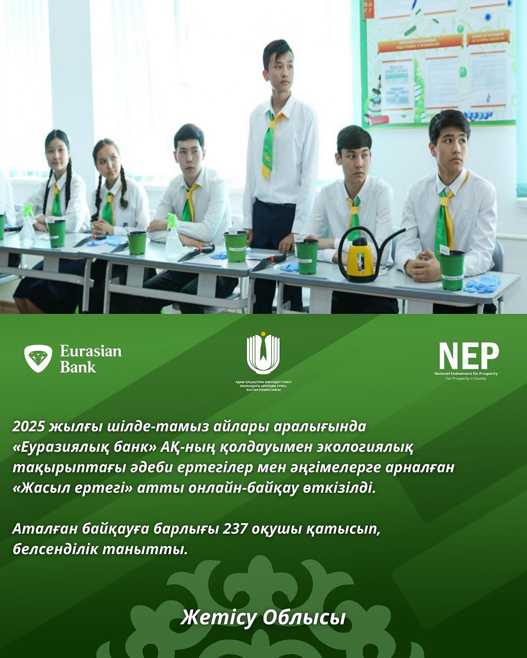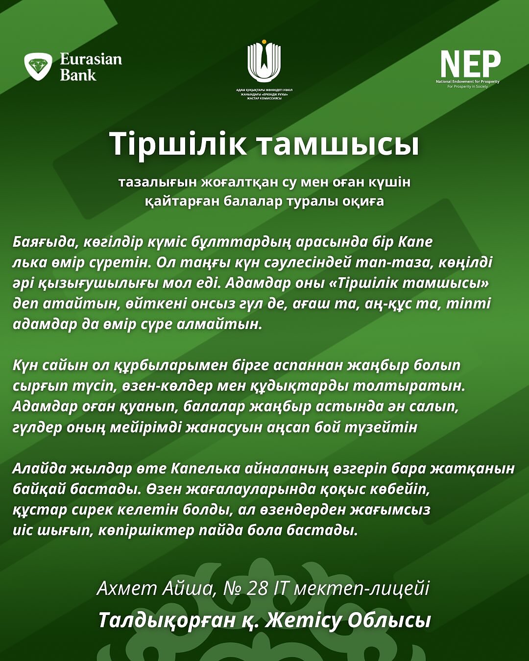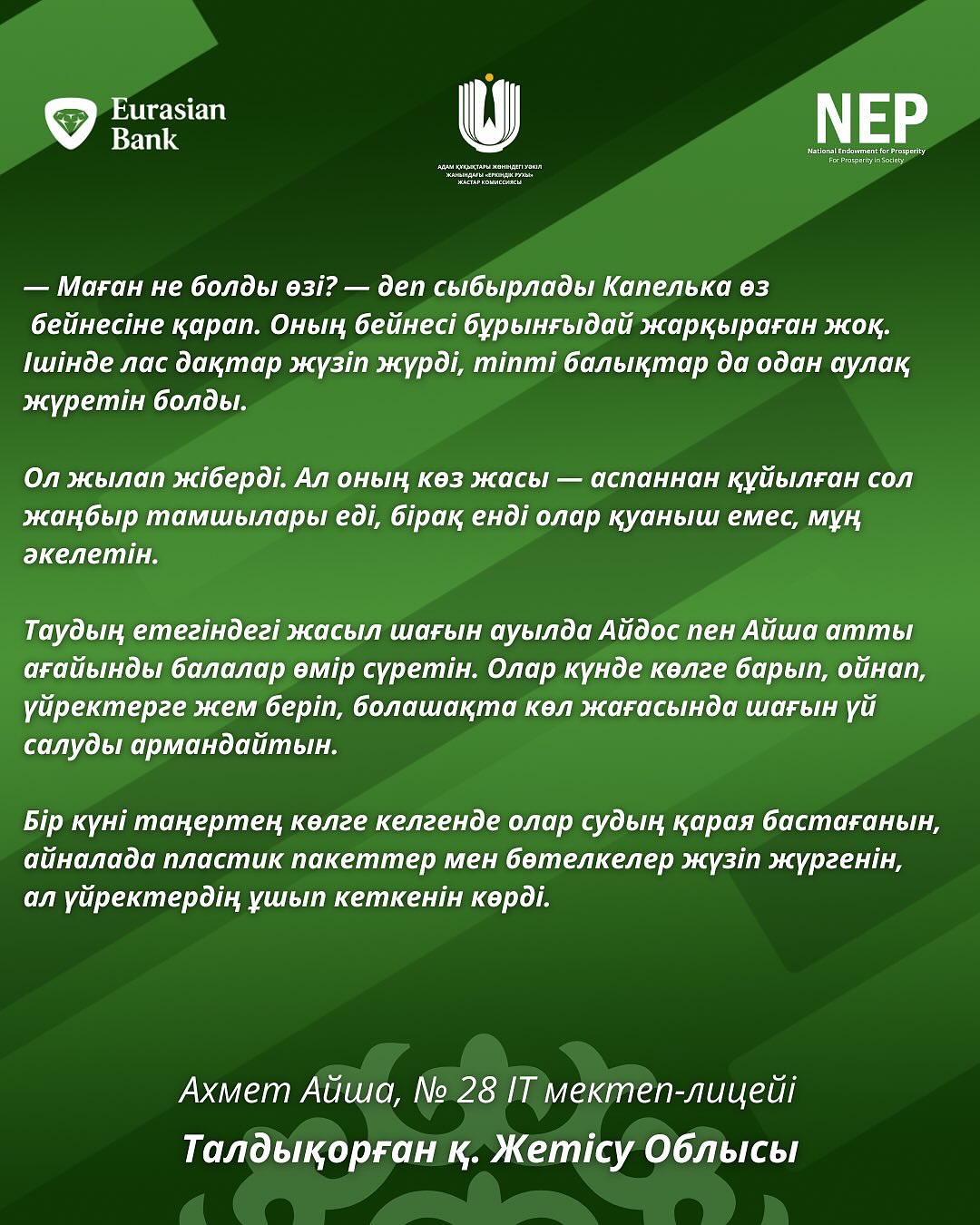 Байқауға екі жүзден астам жас автор белсенді түрде қатысып, өздерінің шығармашылық қабілеттерін көрсетті және өзекті экологиялық мәселелерді терең түсінетінін дәлелдеді. Қатысушылардың жұмыстары орманды, су ресурстарын және жануарларды қорғаудан бастап, саналы тұтыну мен табиғи мұраны сақтауға дейінгі кең тақырыптарды қамтыды.